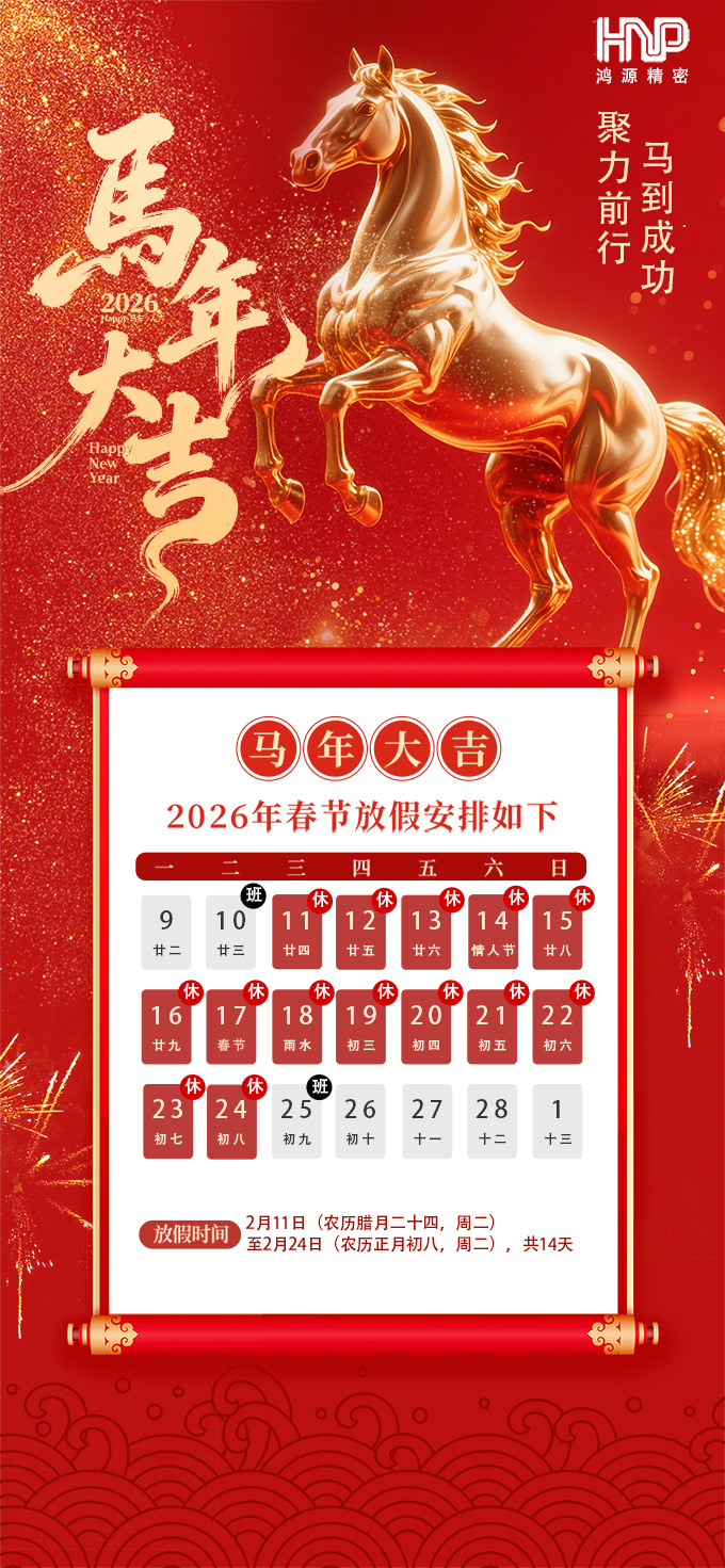 尊敬的鸿源精密客户,亲爱的同事们,大家好!根据国家对2026春节节假日时间的具体安排,结合我司实际情况。